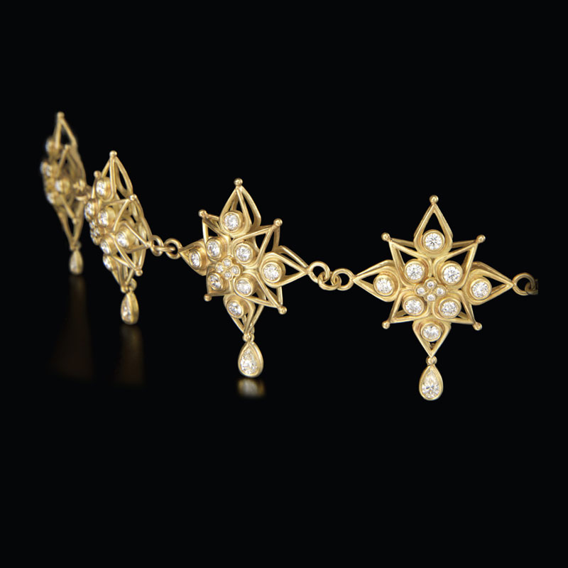 The crazy years – between the two horrid world wars – when Paris was ablaze with the ideas of revolutionary artists from around the globe. Many of them American jazz musicians, dancers, writers, and visual artists.All of them celebrated here in an 18 karat gold link bracelet with articulated 18 karat gold and diamond charms.